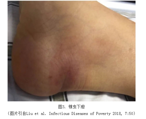 發(fā)熱、頭痛、瘙癢、肌肉疼痛、骨骼疼痛、表情淡漠、共濟(jì)失調(diào)、嗜睡和昏睡等癥狀,錐蟲下疳(gān)(如圖3)、淋巴結(jié)腫大、肝脾腫大等體征。其中,岡比亞錐蟲病發(fā)病進(jìn)程慢,而羅得西亞錐蟲病發(fā)病進(jìn)程快。}