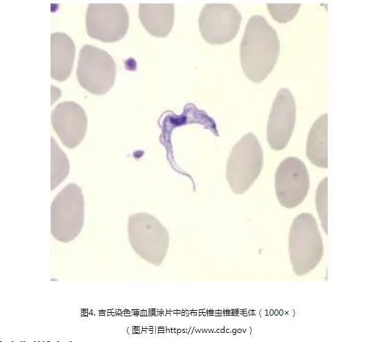 三是實(shí)驗(yàn)室檢查病人血清中布氏錐蟲抗體是否陽性,病人血液、淋巴液、下疳抽吸液、骨髓穿刺液或腦脊液鏡檢中是否查見布氏錐蟲錐鞭毛體(如圖4),或布氏錐蟲核酸檢測(cè)陽性。